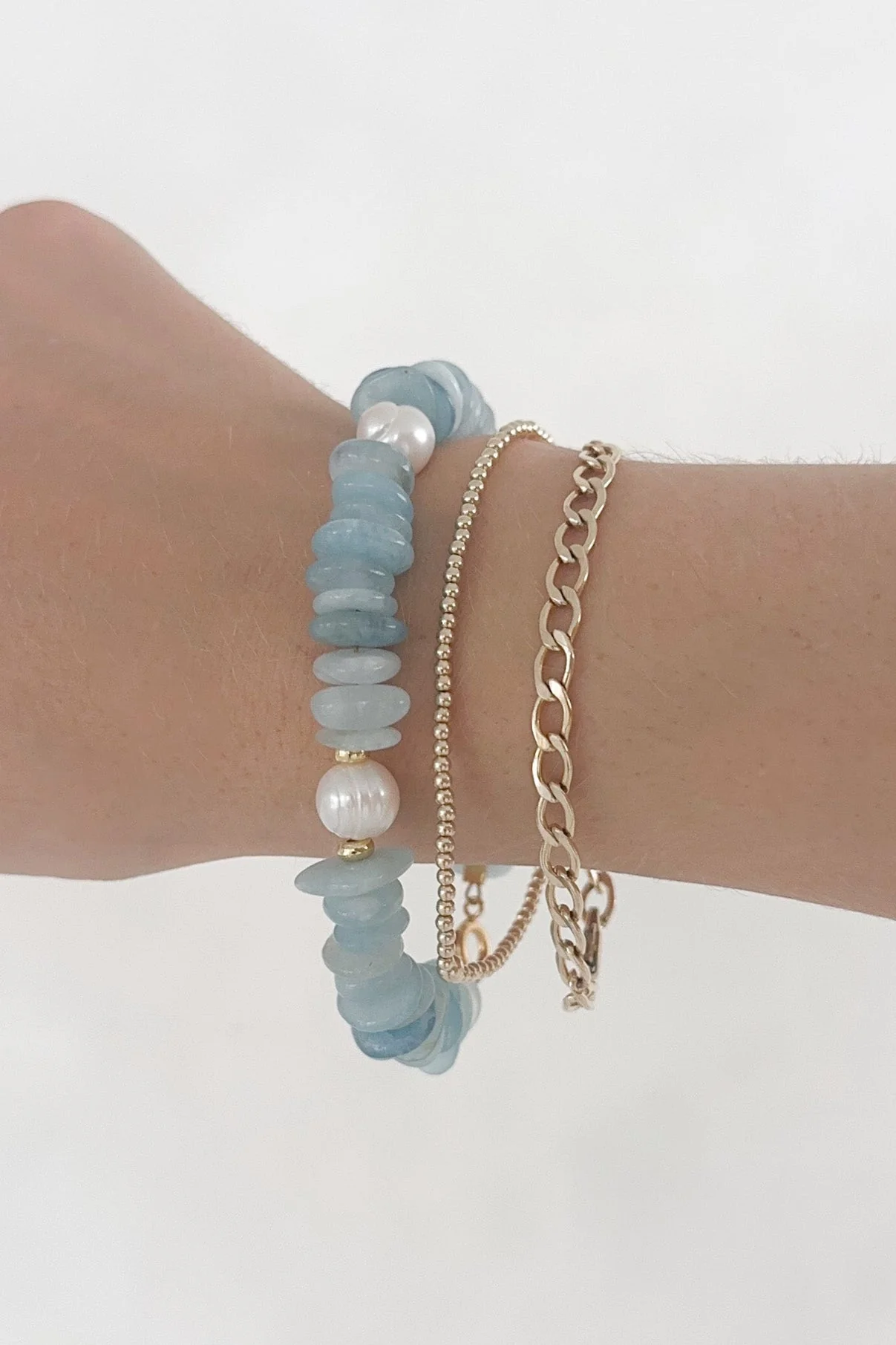 The Bali Pearl & Aquamarine Beaded Bracelet is effortless and handcrafted in Nashville, Tennessee. Featuring freshwater pearls, aquamarine, gold accents, gold clasp, and a 7" length.
