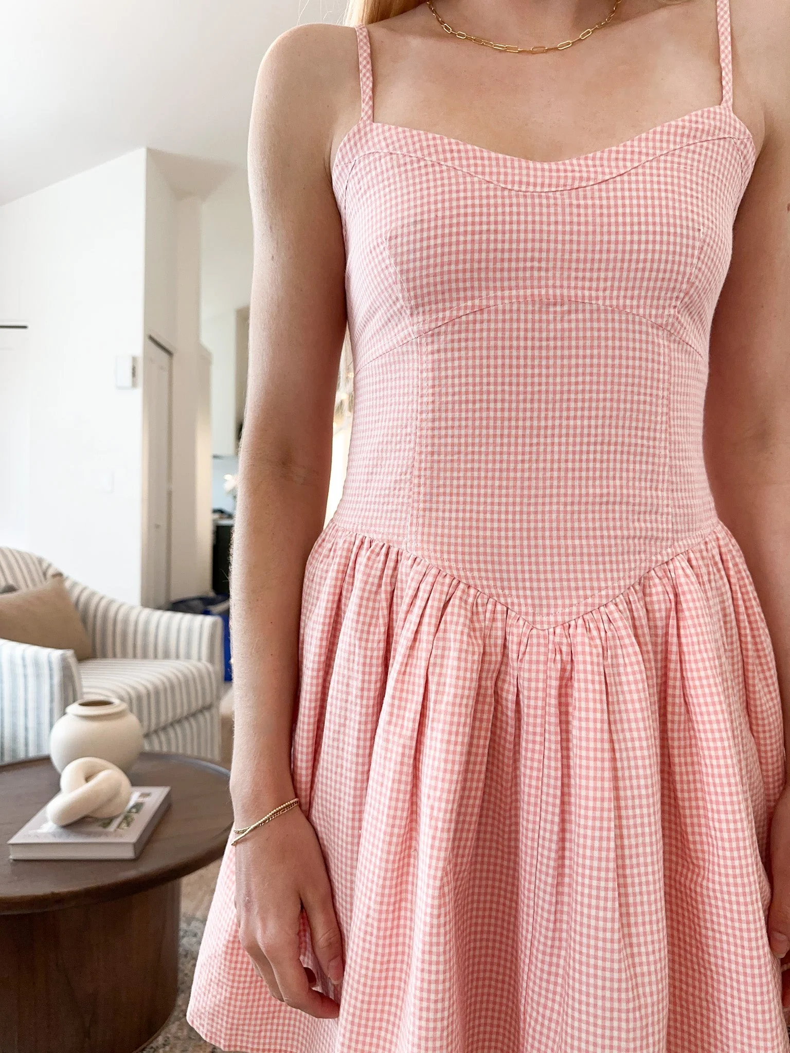 Our Delilah Gingham Mini DressĀ is so girly yet classy,Ā and ready to wear for summer! Featuring adjustable straps, sweetheart neckline, gingham pattern, pink and white colors, lining throughout, side zipper, smocked back, and a mini length.