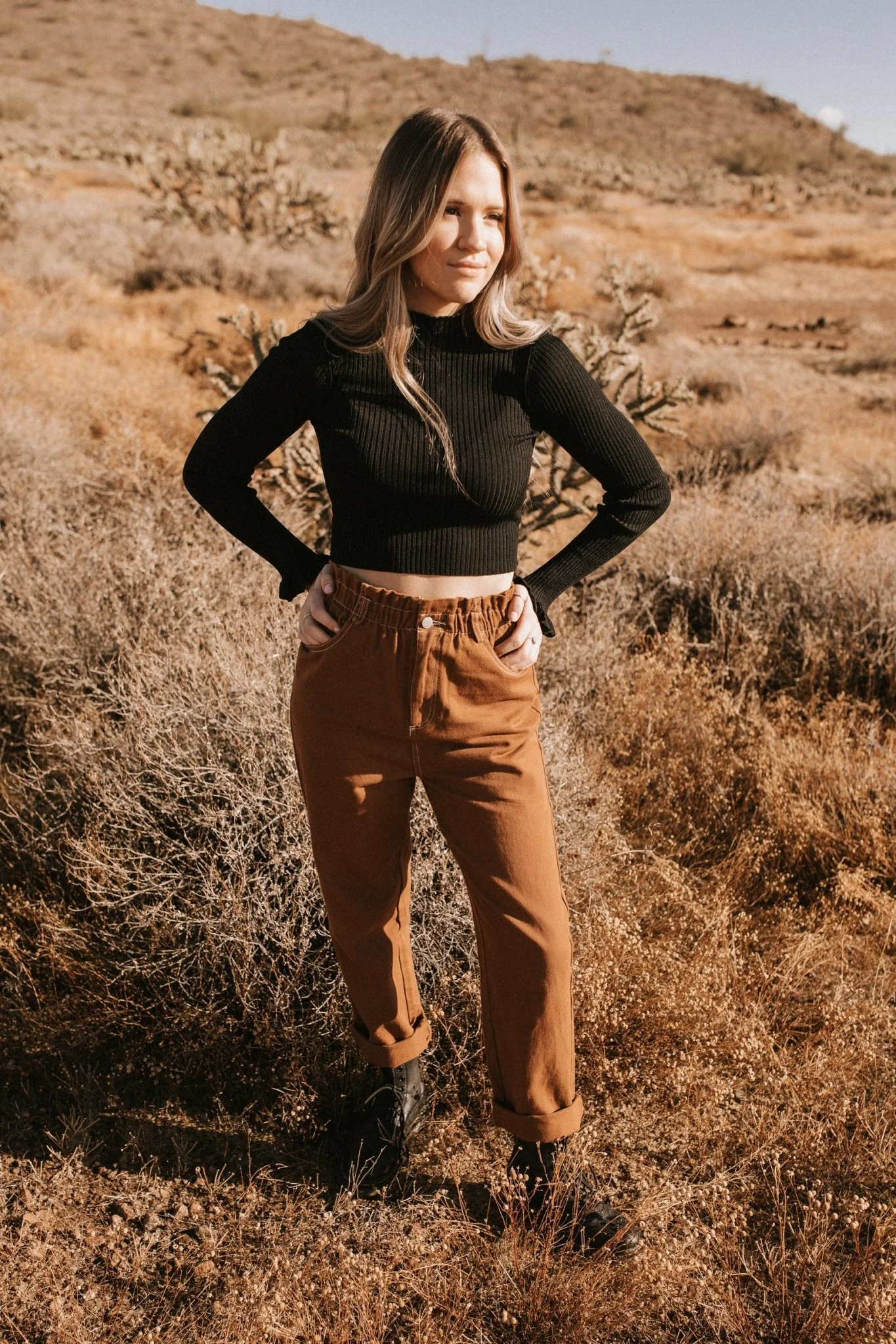 How fun is theĀ Penny Paper Bag Pant? Featuring camel cotton fabric, front and back pockets, elastic and a high paper bag waistline with button closure.