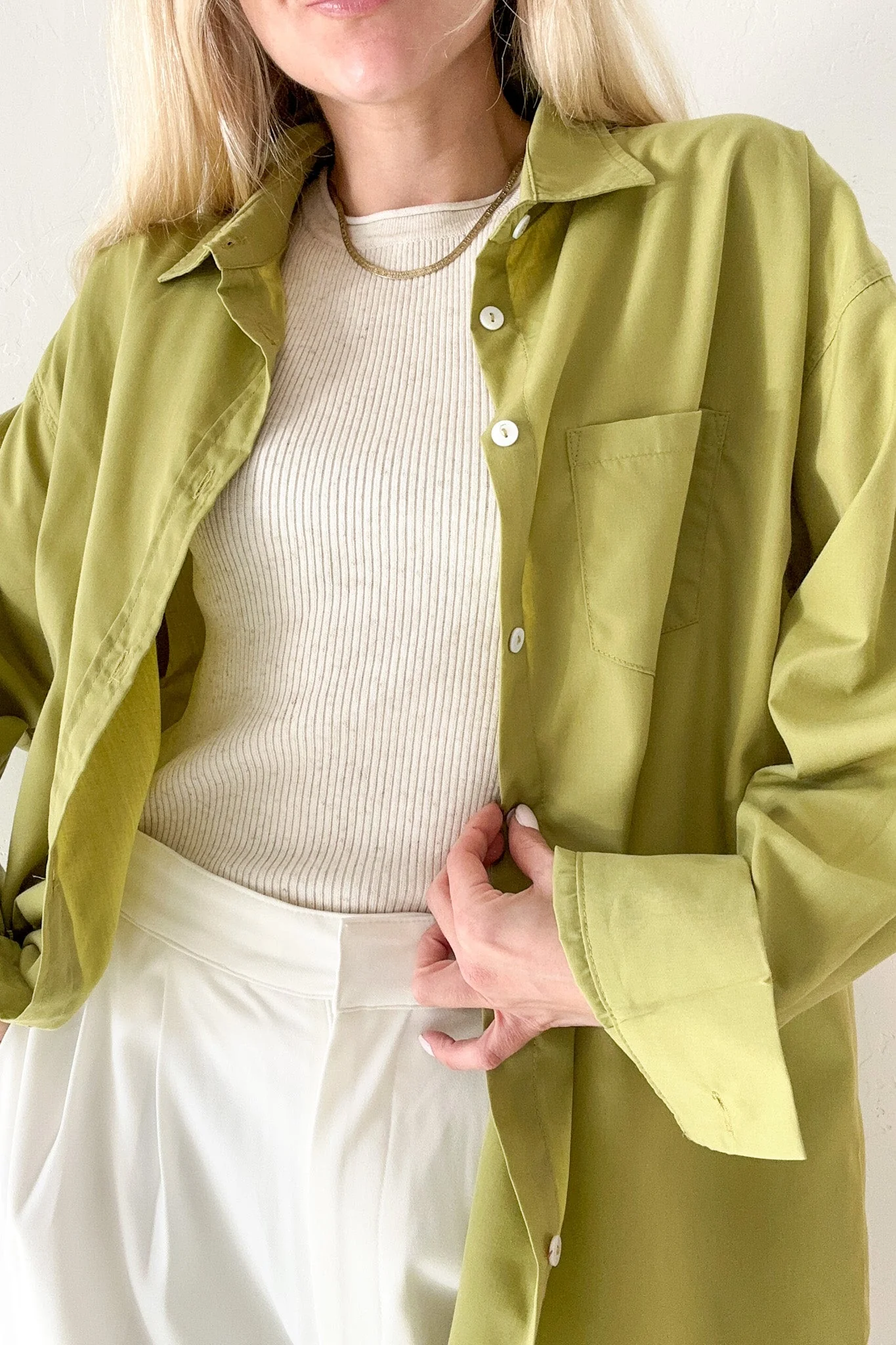 A classic button down always adds a little something something to any outfit! The Tropics Classic Button Down is an essential for any wardrobe. Featuring a front pocket, avocado green color, oversized fit, button down front and a collar.